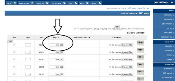 הצגת תמונות בדרך זו תעזור לכם להוריד את החששות של הגולש מקנייה און ליין תשפר לכם את המכירות. ניתן לראות דוגמא - בלחיצה כאן איך ? שנית עליכם לבצע את הפעולות הבאות: 1. עליכם לצלם ברצף מספר תמונות (בין 2 ל 12 תלוי כמה מעלות אתם רוצים להציג בסופו של דבר) באמצעות כל מצלמה שתרצו. 2. עליכם להיכנס למממשק קונימבו למוצר אותו אתם רוצים לעדכן ולעלות את קבצי התמונות שצילמתם. 3. עליכם להוסיף בשדה alt לקובץ את הטקסט הבא: item_360 ולשמור. זהו, המוצר מוצג ב 360 מעלות כך זה נראה בממשק: | |