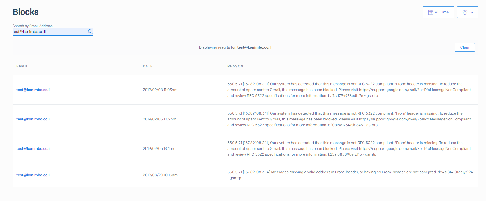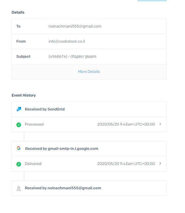 ניתן להכניס כתובת מייל של הלקוח קצה, עד 7 ימים אחורה, ולראות אם המערכת הוציאה את המייל או לא , לדוגמא: